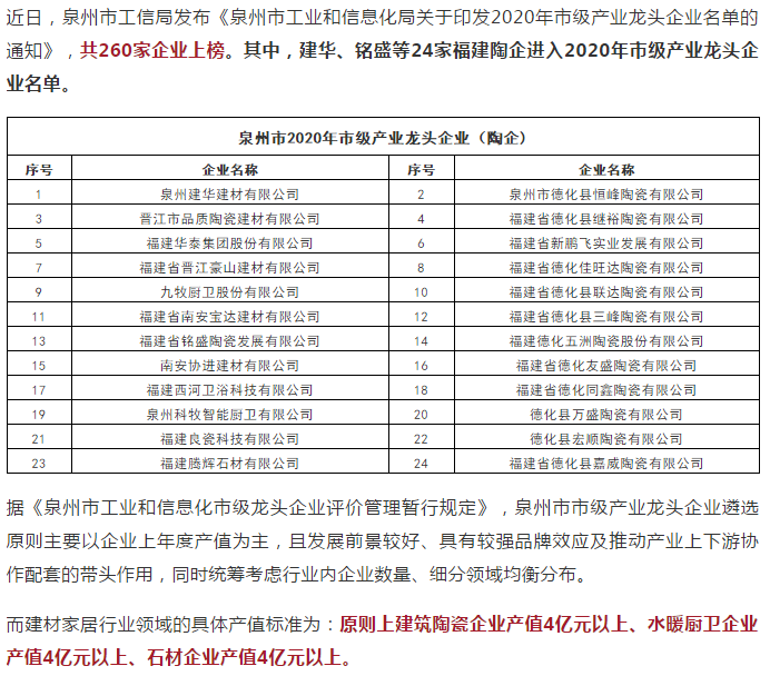恭喜南安協(xié)進(jìn)建材有限公司入選泉州市工信局發(fā)布“2020年市級(jí)產(chǎn)業(yè)龍頭企業(yè)”。