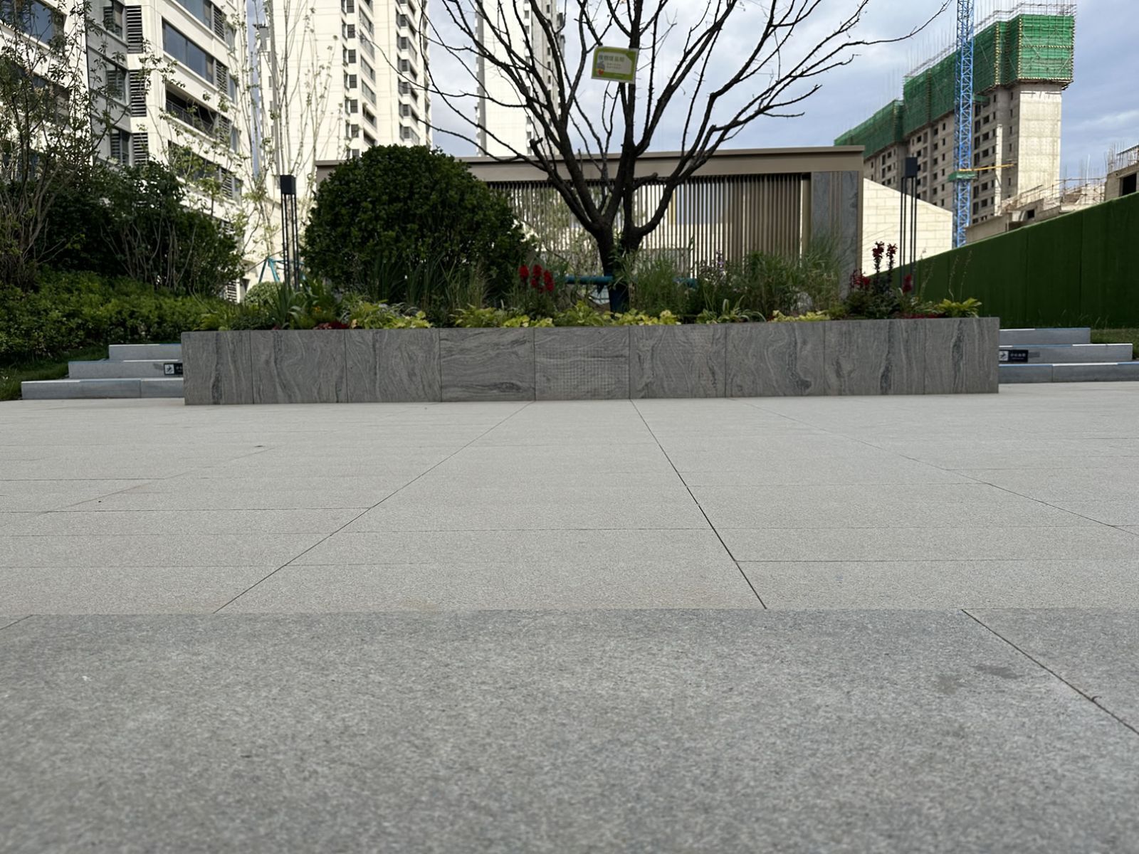 園林景觀巧妙運(yùn)用了浪花白、浪淘沙、檀香木、黃金麻、芝麻灰等多款協(xié)進(jìn)地鋪石設(shè)計(jì)鋪貼。